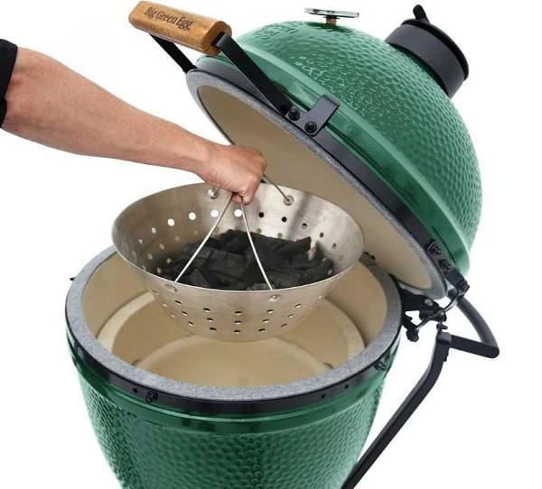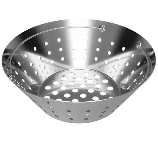 The Big Green Egg Stainless Steel Fire Bowl is a quick and easy way to lift charcoal out of the EGG for easy cleanup. Two convenient handles make it easy to shake out cool ash, allowing you to maximize airflow for quicker startups.