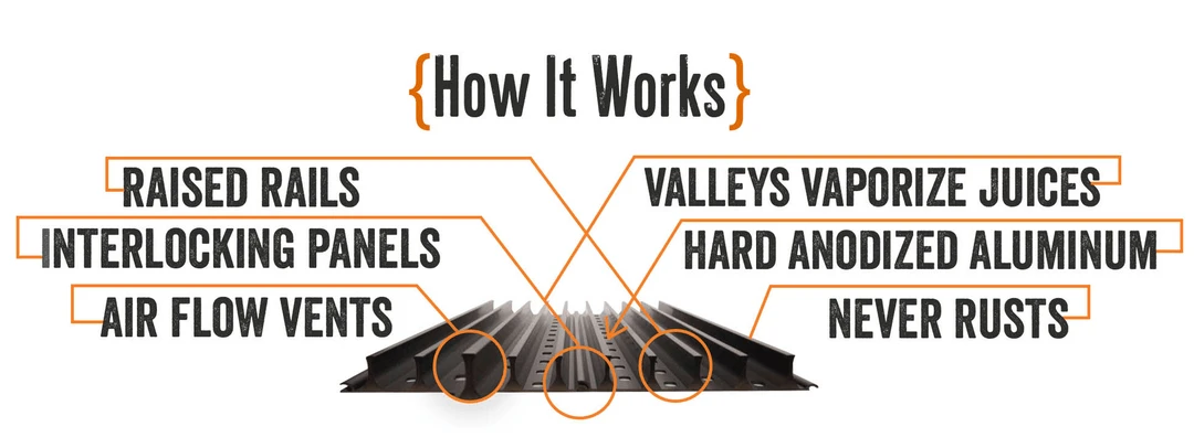 GrillGrates with the GrateTool are the ultimate upgrade for any gas grill. Whether you go on top of your existing set or entirely replace your stock grates, you’ll notice the difference. GrillGrates are reversible interlocking panels, giving you two grilling surfaces; rails up or on the flat side. GrillGrates tame flare-ups and even out the hot and cool spots common with all gas grills. This gives you even, stable temperatures across the cooking surface. Constructed from hard anodized aluminum, GrillGrates will never rust. Made in the USA. The GrateTool is made in China.