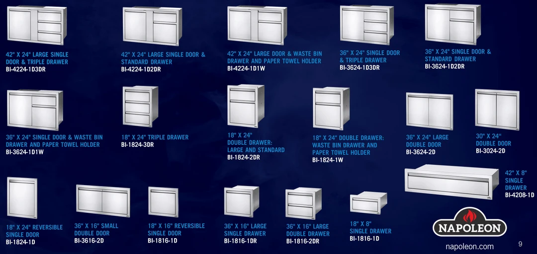 Creating your own custom grill island has never been easier with Napoleon’s Built-In Components. Every great outdoor kitchen needs storage; this 36″ x 24″ built-in component has everything you need for storage. Featuring two generous drawers and a single large door for storage. The stainless steel construction, soft closing hardware, seamless trim, and anodized aluminum handles provide durability and endless installation possibilities.