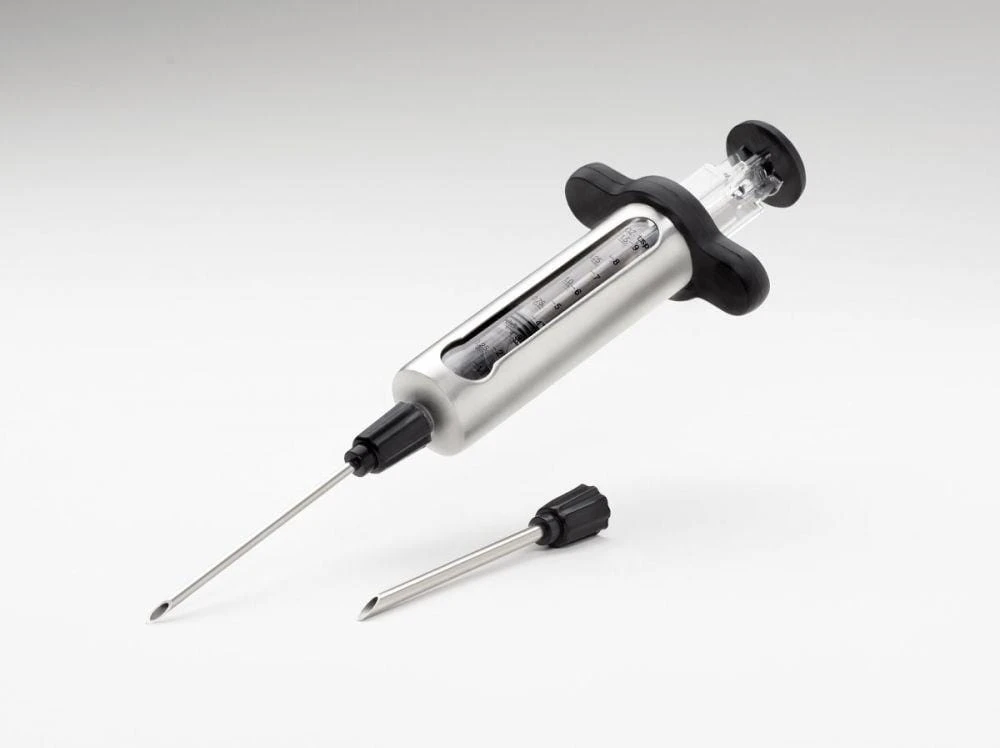 Make your food even more flavorful and prevent dryness with the Napoleon Stainless Steel Marinade Injector. The body is made from stainless steel and features a see-thru window with ounce and teaspoon measurements for measuring the perfect portions. There are two interchangeable needles for injecting based on the type of solution you are using. The smaller gauge is perfect for liquid sauces, butter, wine, and thin marinades. The larger gauge needle is perfect for marinades and injections with small solids like garlic and herbs. Maintaining your injector is easy with the included cleaning brushes. Also included, is a fantastic storage case to make sure everything is stored safely and together. Add the Stainless Steel Marinade Injector to your accessory arsenal and prepare meals that are juicer and more flavorful than ever.