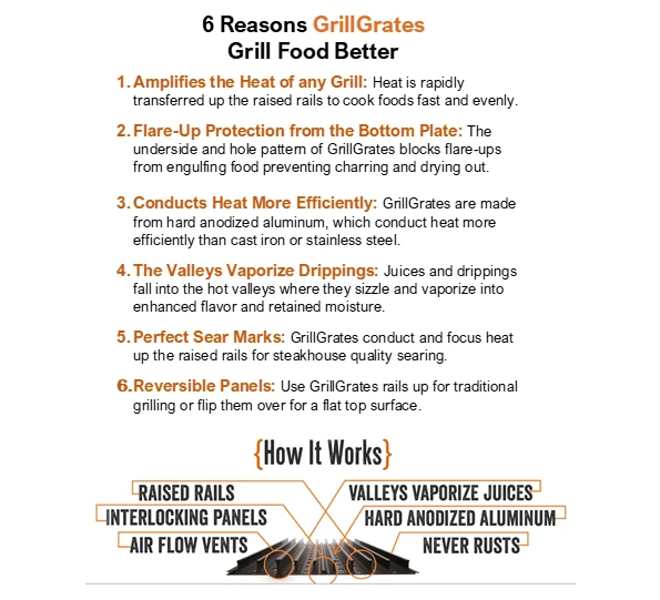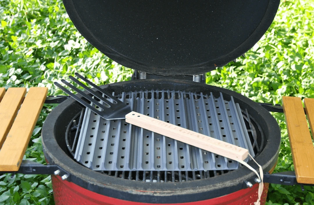GrillGrates provide protected, high-heat grilling on the Large Big Green Egg. The bottom plate blocks hot rushing air and flames from charring and drying out food, keeping the juices sizzling with the food instead of feeding the flames. GrillGrates are used on top of the existing grate surface. Every set comes with a GrateTool which is part fork, part spatula that fits between the rails to get under your food and lift it without scraping.